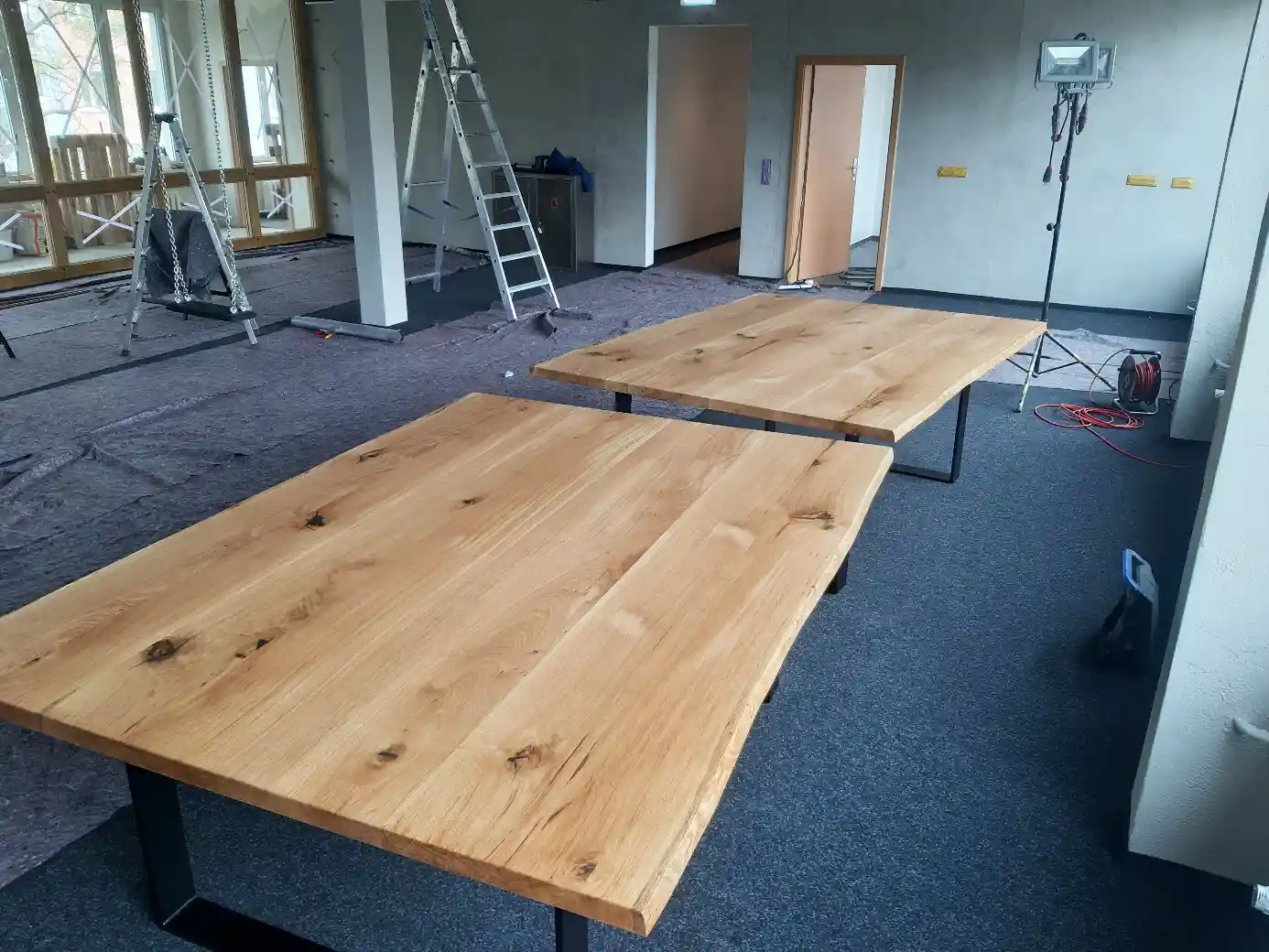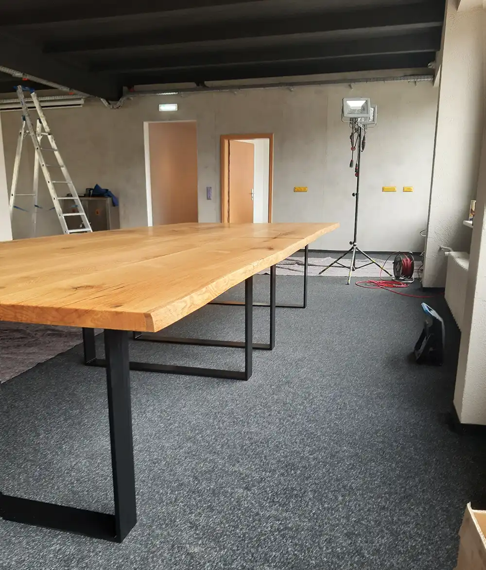 Die organische Kante im Randbereich macht den Konferenztische aus massiver Eiche zu einer Besonderheit. Der Stirnstoß ist nach entsprechendem Maserverlauf der Bohlen. Die Eichenplatte wurde geölt. Ein massives Eisengestell unterhalb der Tischplatte, gepulvert in schwarz, dient als sicheres Standbein.