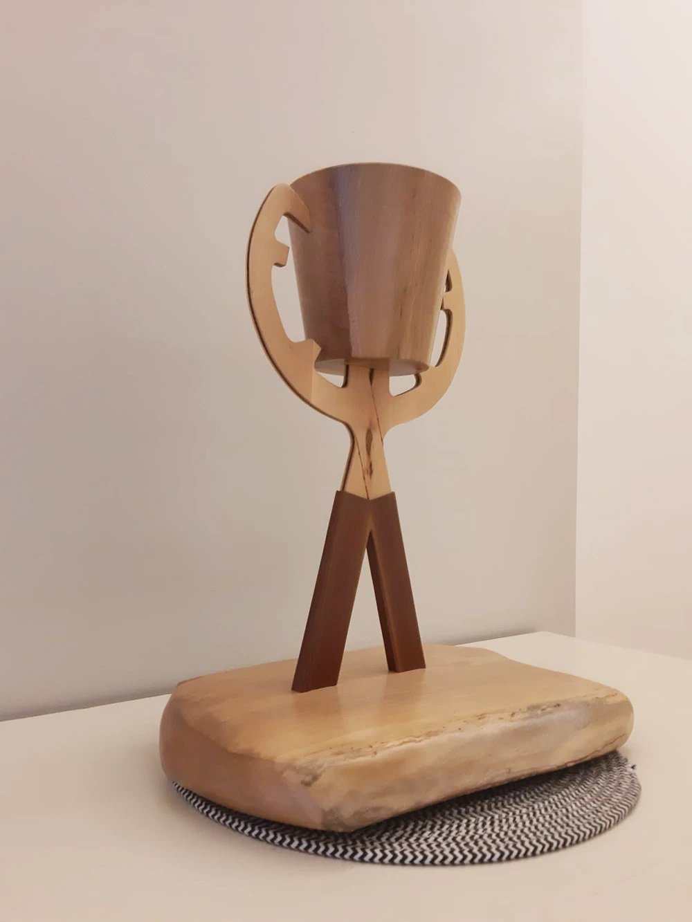 Ein weiter Pokal ist für den Wettkampfaufbau der A-Länge. Hier wurden 3 Hölzer miteinander kombiniert. Die Pokalplatte wurde aus Roteiche gefertigt, A-Länge und Schlauchturm aus amerikanischem Nussbaum und der Saugkorb schließlich aus Ahorn.