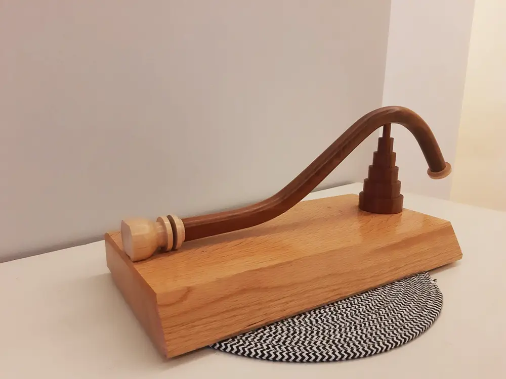 Hier wurde ein Hydrant als ganz besonderer Pokal entworfen. Während bei der Fußplatte und den Kappen Esche verwendet wurde, bestehen das Steigrohr und die Abzweige aus Erle. Die Oberfläche ist klar und seidenmatt lackiert worden.