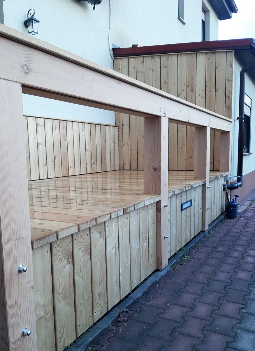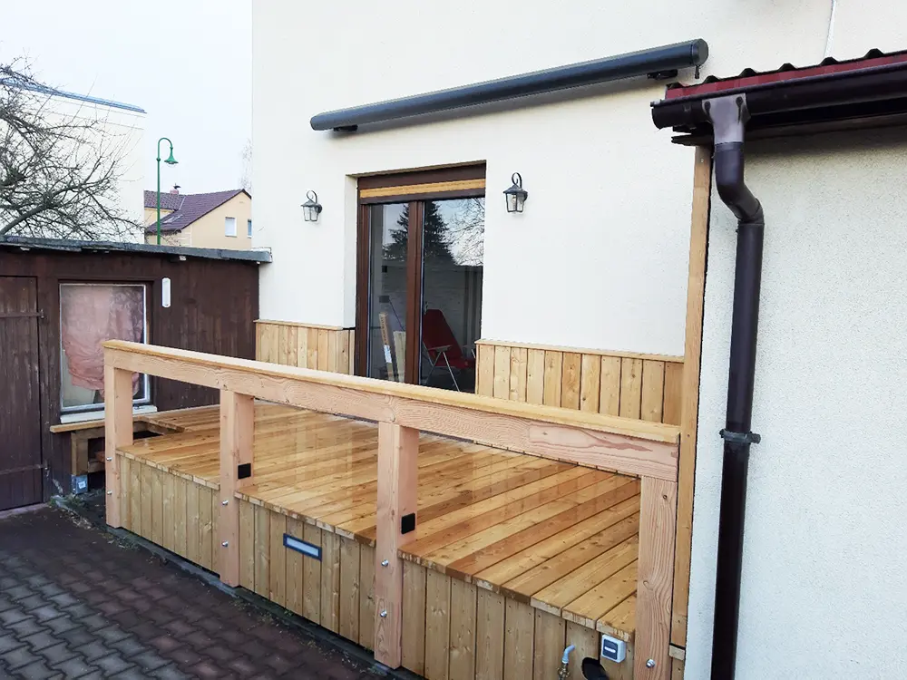 Die Terrasse besitzt eine Wandverkleidung aus sibirischer, massiver Lärche. Es gibt eine Lauflinie von Wandverkleidung über den Laufdielen bis hin zur Brüstungsverkleidung. Das Holz ist zudem geölt. Bei zunehmender Dunkelheit kommt der hinter der Wandverkleidung verlegte Lichtschlauch zur Geltung.