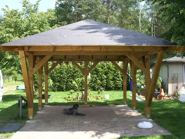 Das Schnitt- und Rundholz wurde maßgerecht angerissen und bearbeitet (klassischer Abbau) und schließlich mit Holznägeln gezapft. Als Grundmaterial diente die KVH-Fichte. Alle Balken sind lasiert worden. Die Spundbretter wurden als Sichtschalung verbaut und anschließend lasiert.