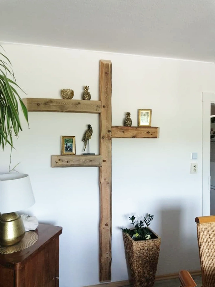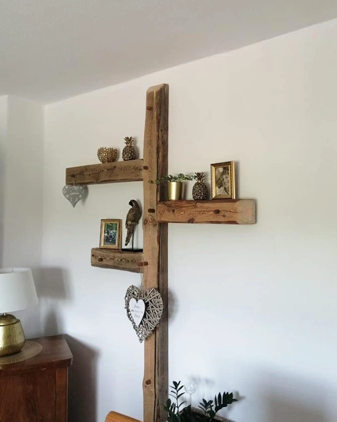 Diese Wanddekoration aus Altholz besitzt eine rohe, gebürstete Oberfläche. Die Seitenablagen sind gezapft mit Holznägeln und Stirnfase.