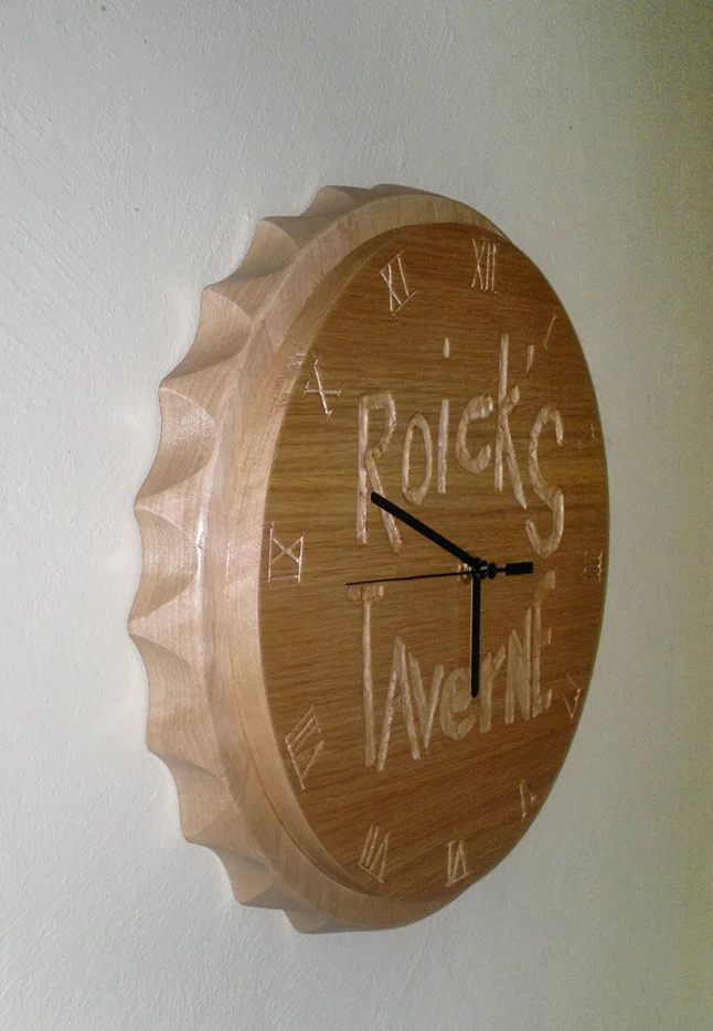Ein ganz besonderes Aussehen hat diese Wanduhr in Bierdeckelform. Der Grundkörper besteht hierbei aus Ahorn. Die Decklage ist furniert mit Eiche. Der Außenradius ist gefalzt und ausgekehlt – so entsteht die Bierdeckelform. Als Zahlen sind römische Ziffern eingraviert. Für die Langlebigkeit ist die Oberfläche in klar und seidenmatt lackiert.